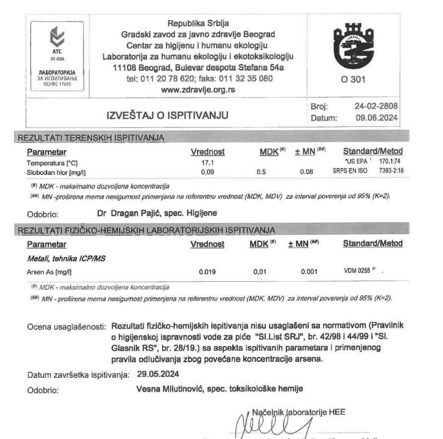 Zavod je uzeo tri uzorka, i to prvi uzorak 14. maja, drugi 21. maja i treći krajem meseca, tačnije 28. maja. U izveštaju koji su prosledili 9. juna stoji rezultat za sva tri rezultata da je bilo prisutno povećano prisustvo arsena.