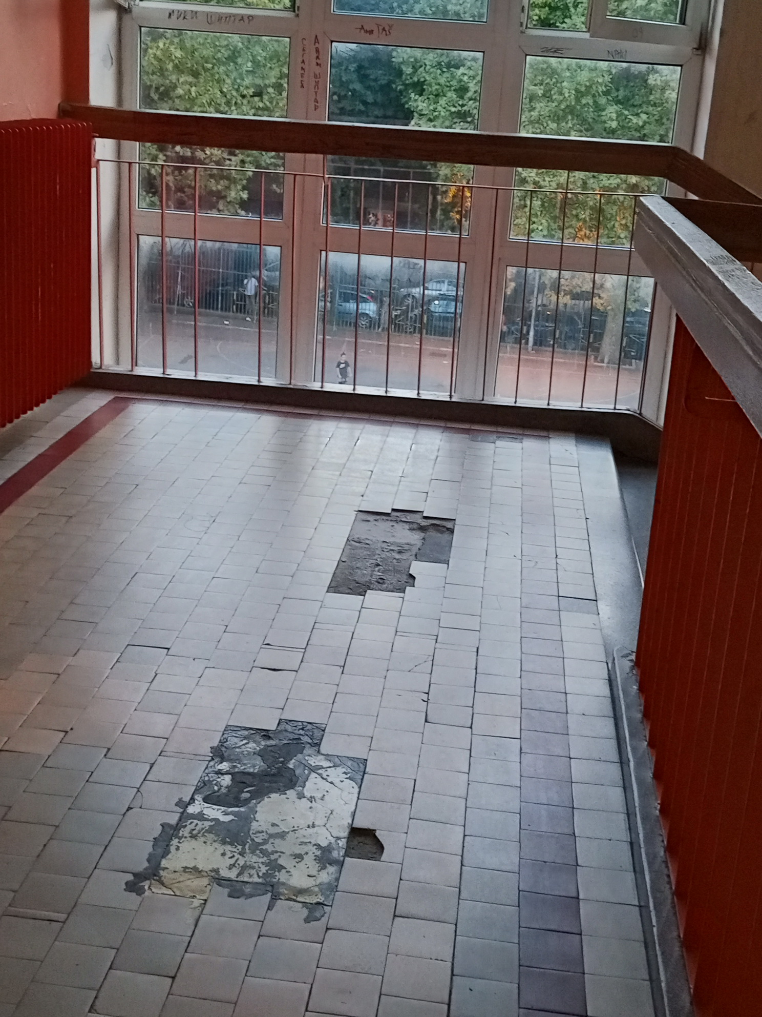 „Veliko dvorište“ škole pretvoreno je u improvizovani parking. Iako Pravilnik predviđa ograničen ulaz za zaposlene i dostavu, kapija je stalno otvorena, a kontrola vozila ne postoji. Situacija eskalira u popodnevnim satima kada dvorište preplave automobili roditelja čija deca dolaze na privatne treninge u školskoj sali.