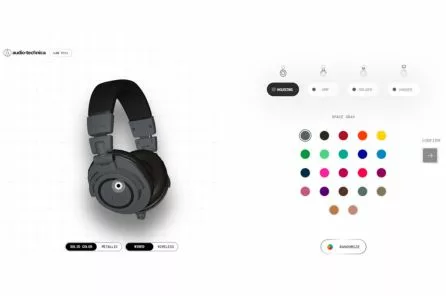 Gornji desni ugao prikazuje deo slušalice za koji birate željenu boju. Naravno, to pokazuje i tačka na slušalicama. Imate 4 dela za koje treba odabrati boju. Nije moguće promeniti boju unutrašnjih jastučića, kruga na slušalicama, znaka i rajfa na glavi. Ponuđene su Vam 22 boje koje možete postaviti po želji. To su boje koje Audio-Technica ima u planu i u proizvodnji.