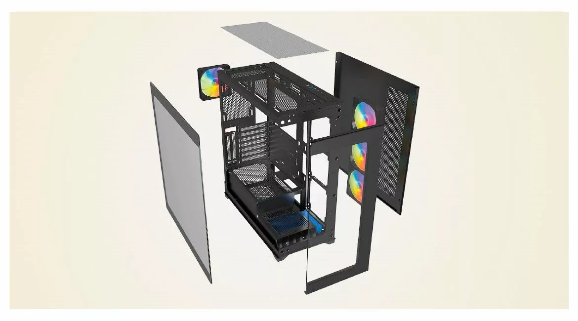 Jedan od najsvetlijih aspekata je njegov ARGB (Addressable RGB) sistem osvetljenja. Kućište je opremljeno sa četiri ARGB ventilatora (dolaze u kompletu i već su instalirani) koji omogućavaju korisnicima da kreiraju različite svetlosne efekte i boje prema sopstvenim željama. Ova tehnologija pruža visok nivo prilagodljivosti, jer korisnici mogu birati iz širokog spektra boja i efekata poput statičkog osvetljenja, disko efekta, i prelaza boja, sve preko kontrolera ili kompatibilnog softvera.