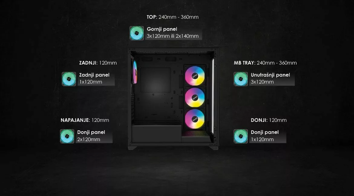 - Top (Gornji) panel: Kućište podržava do tri 120mm ventilatora ili dva 140mm ventilatora na gornjem panelu. Ovo omogućava korisnicima da instaliraju ventilatore visokih performansi ili jedno vodeno hlađenje koji mogu poboljšati protok vazduha kroz kućište. Ova lokacija je posebno važna za izbacivanje toplog vazduha iz unutrašnjosti kućišta, što pomaže u održavanju niske temperature unutrašnjih komponenti.