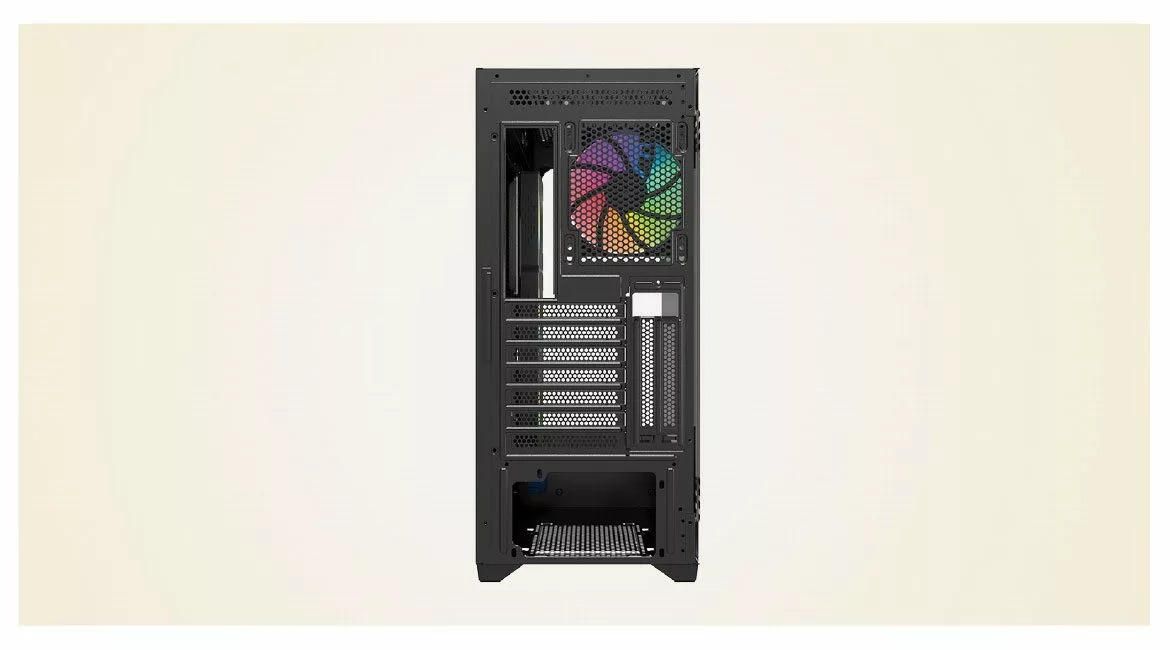 - Pozadinski panel: Kućište takođe uključuje mesto za jedan 120mm ventilator na zadnjem panelu. Ovaj ventilator pomaže u dodatnom izbacivanju toplog vazduha iz kućišta.
