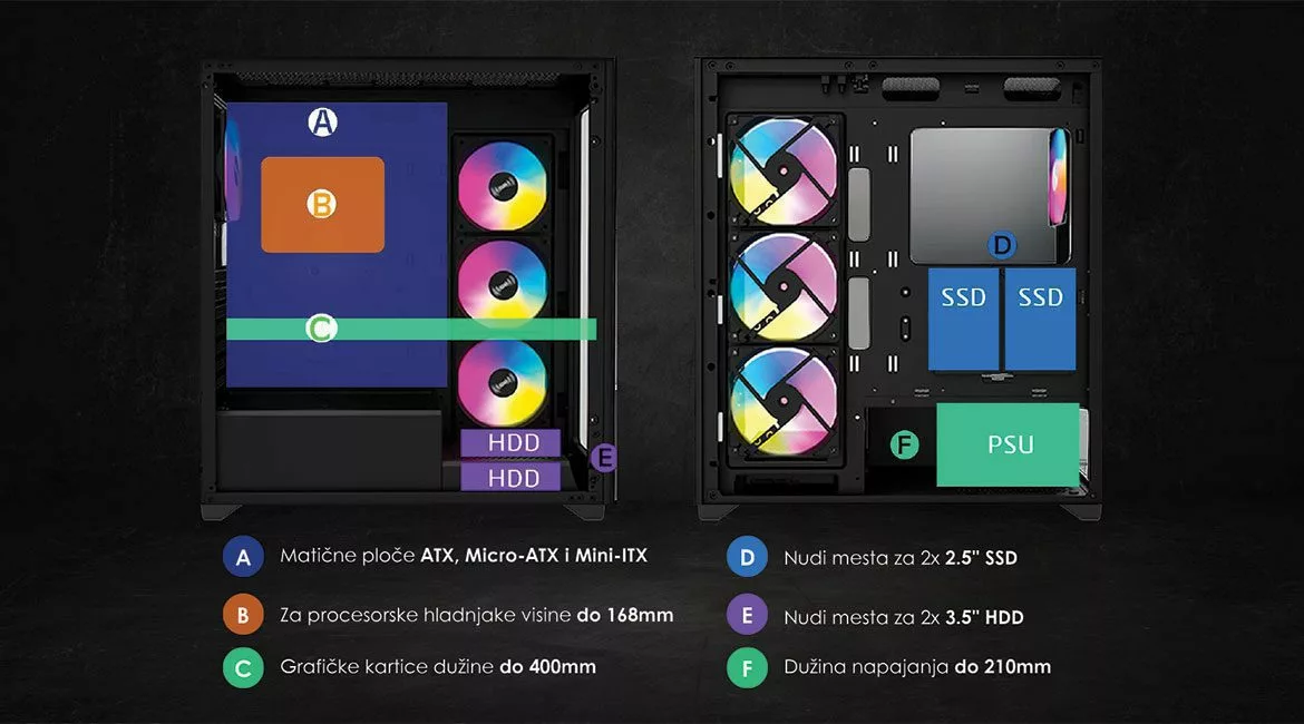 Dimenzije kućišta: 450 x 210 x 450 mm (D x Š x V), što omogućava dovoljno prostora za većinu komponenti i dodataka.